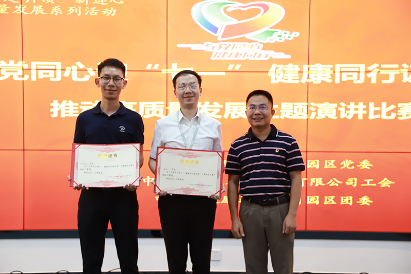 火炬開發(fā)區(qū)黨群服務(wù)中心主任李慧為二等獎獲得者林偉潮(民眾沙仔園區(qū)發(fā)展部)、鄭皓文(科技創(chuàng)新部)頒獎